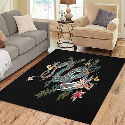 Pinbeam Area Rug Asian Dragon Flowers Tattoo Patch Black Chinese Japanese Home Decor Floor Rug 3 X 5 Carpet